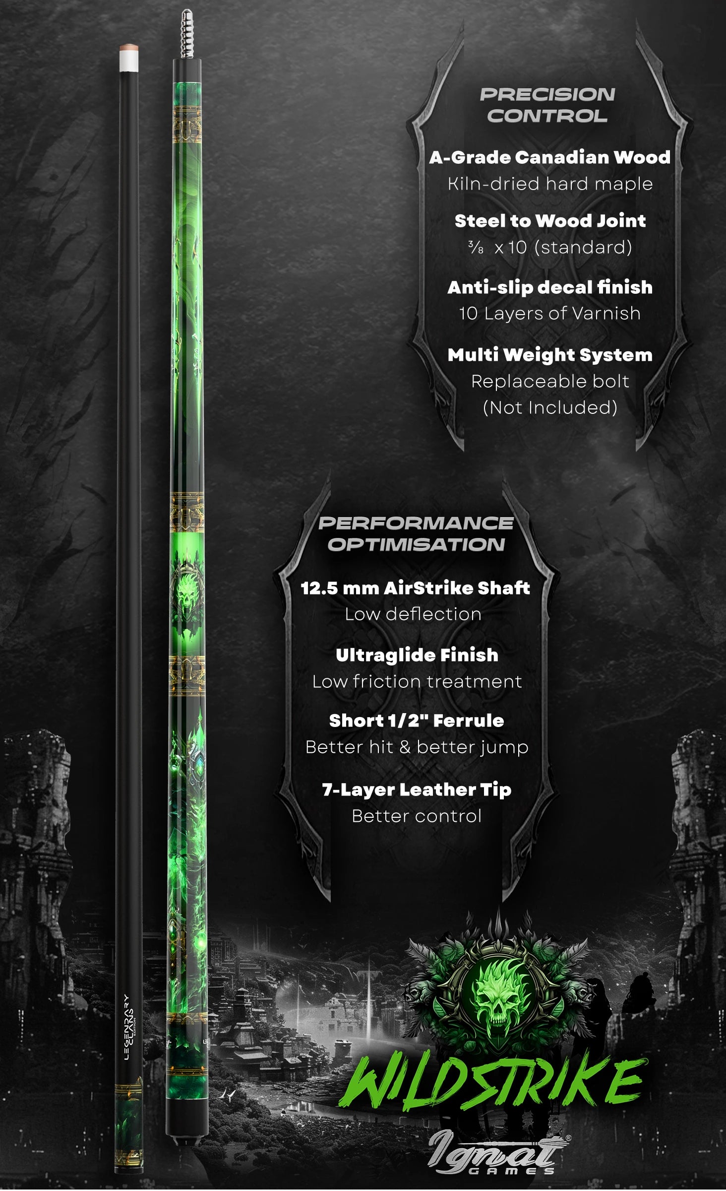 • Legendary Clans Performance Edition – Crafted with A+ grade kiln-dried Canadian Maple and topped with the AirStrike 12.5mm high performance shaft, this 58” pool cue stick is ready to impress any pool game enthusiast.
