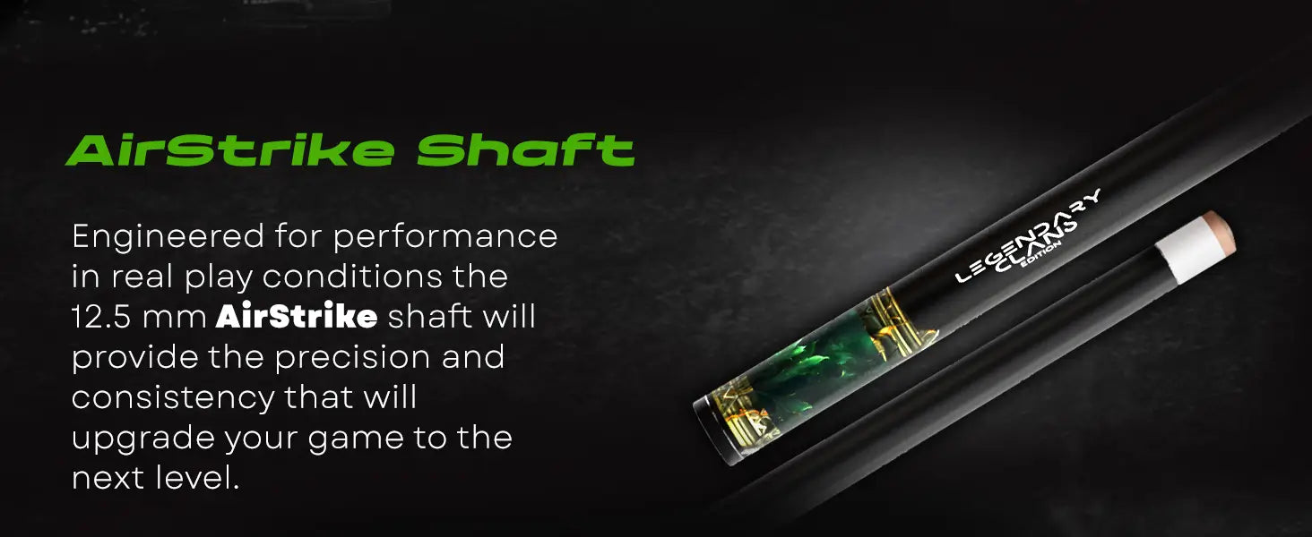 • The New AirStrike Shaft – We heard your voice and designed for our billiard cue stick a brand new 12.5 mm shaft combining lightweight construction with unmatched precision. AirStrike shaft provides ultimate in feel, feedback, and consistent accuracy.