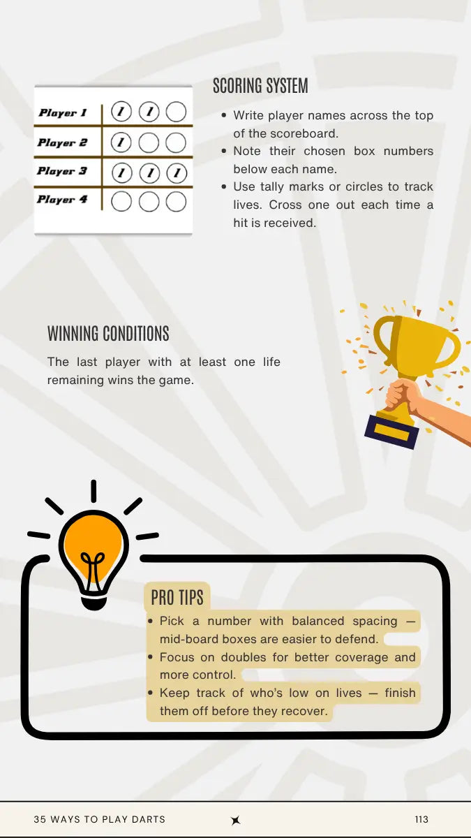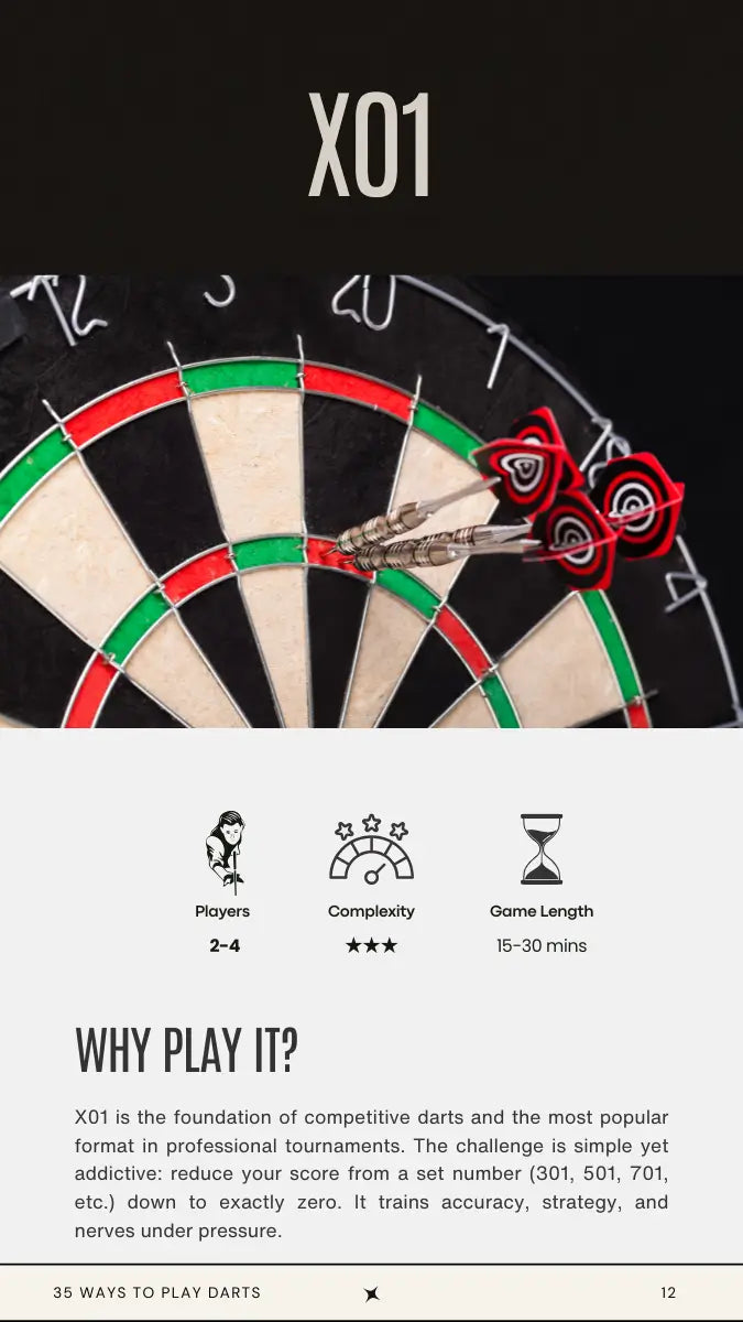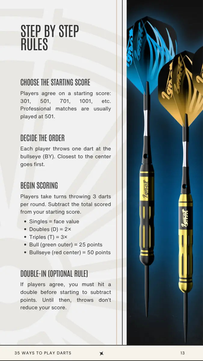 Get a sneak peek of what’s inside “35 Ways to Play”. From step-by-step rules and colorful illustrations to ready-to-use scoreboard templates—this eBook is packed with everything you need to start playing darts like a pro.