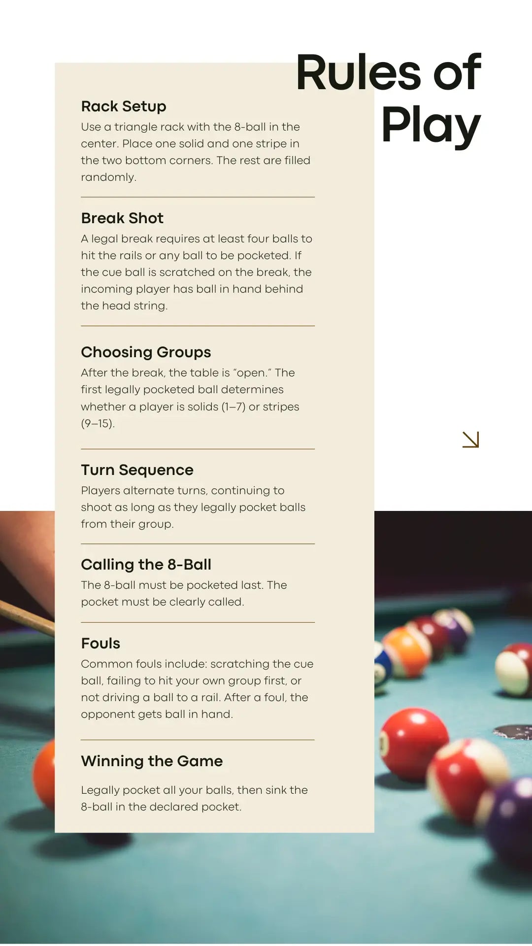 This ebook is more than just rules — it’s a step-by-step path to better play. You’ll discover how to build a solid stance, aim with confidence, master spin, and understand the unique strategy behind every billiards game. Whether you’re playing at home, in a bar, or in competition, you’ll always have a trusted companion at your side.