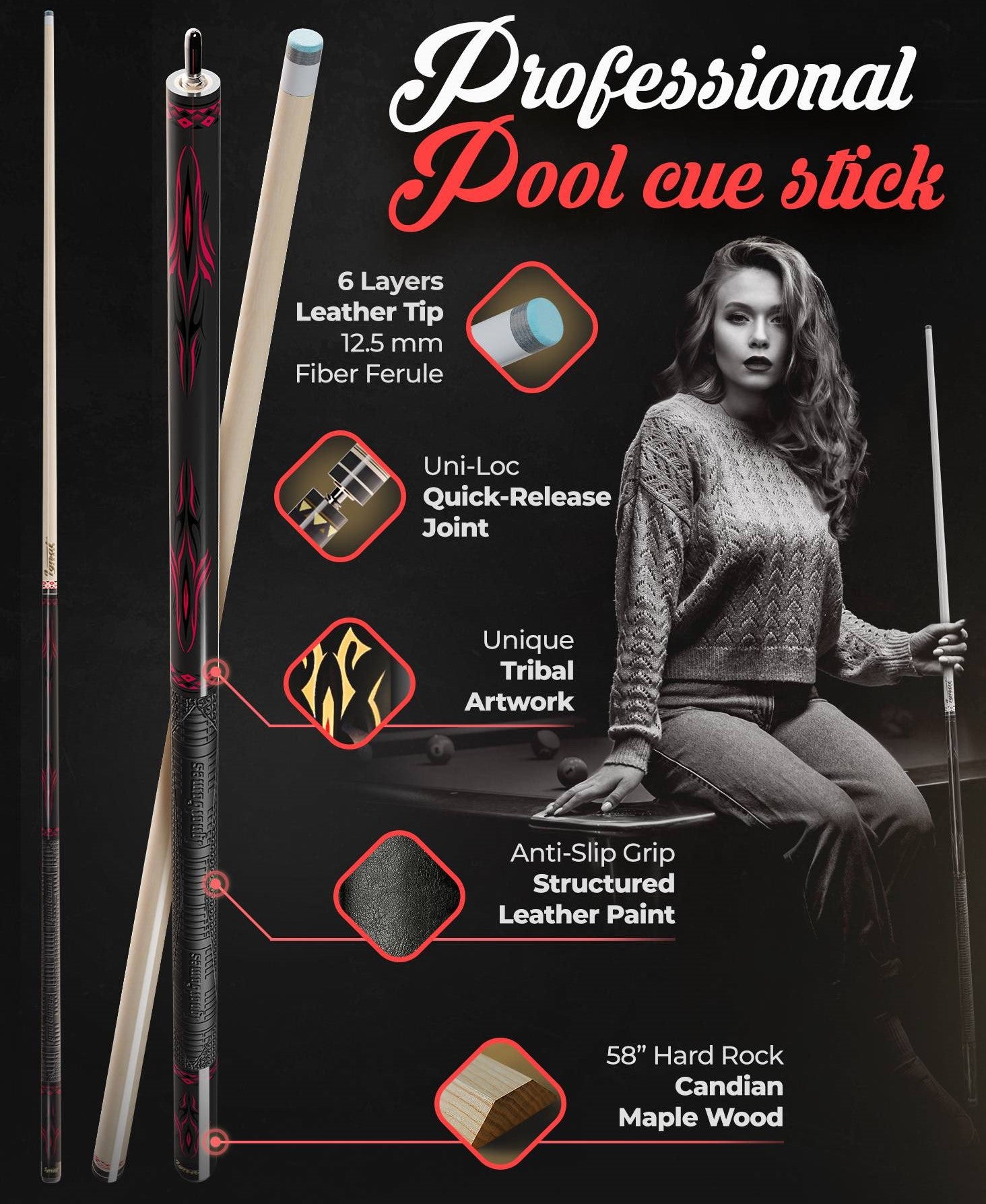 • Materials & Build: 18 oz. 58" 2-piece cue made from A-grade Canadian maple wood, featuring a low-deflection shaft, 12.5 mm leather tip, fiber ferrule, and 5/16x18 fast-lock stainless steel joint.